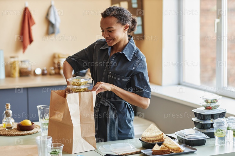 Молодая чернокожая женщина распаковала пакет для доставки еды на кухне и счастливо улыбалась