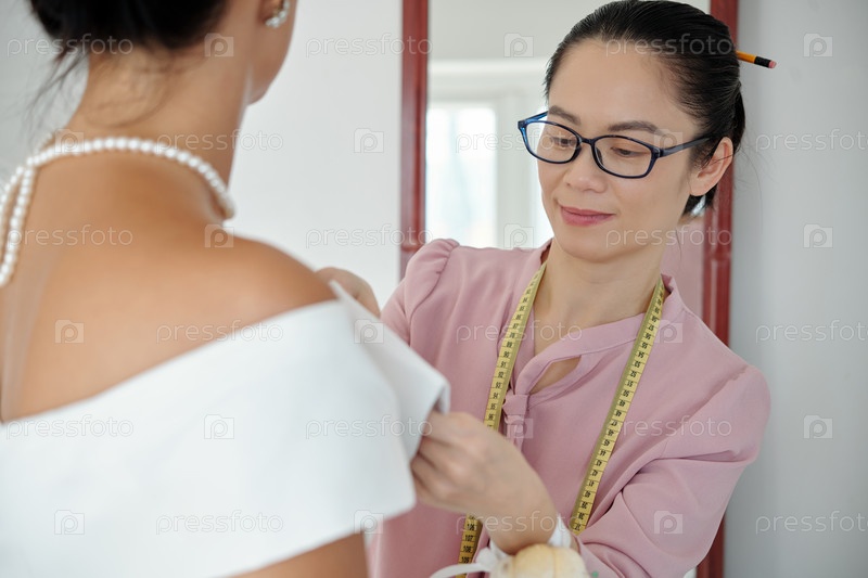 Швея, застегивающая лук на платье
