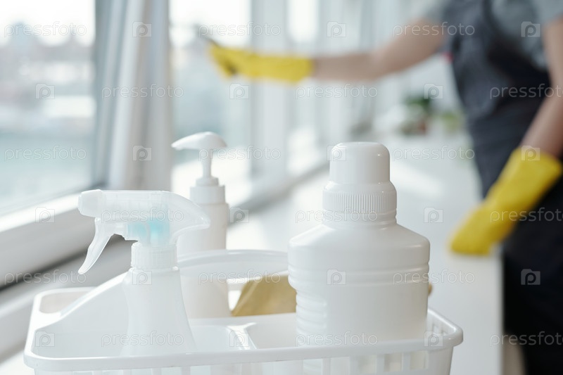 Три пластиковых бутылки, содержащие моющие средства для мытья окон на подоконнике