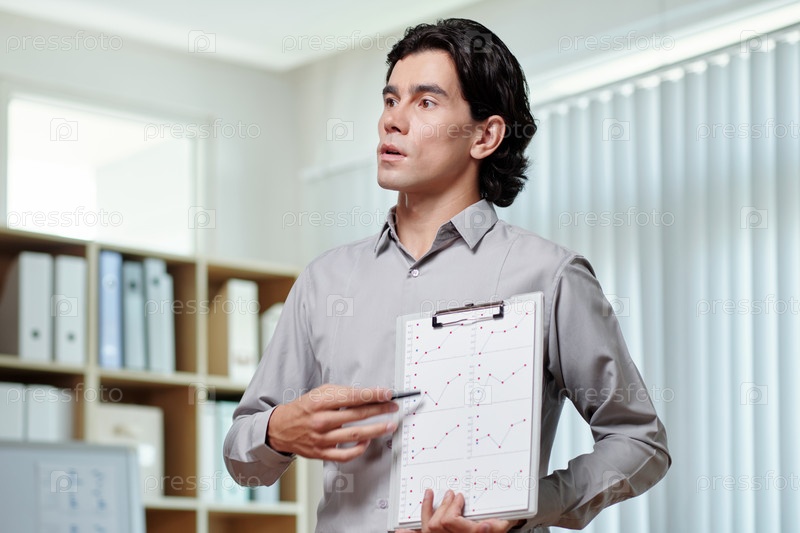 Молодой бизнесмен объясняет графические данные в финансовом документе