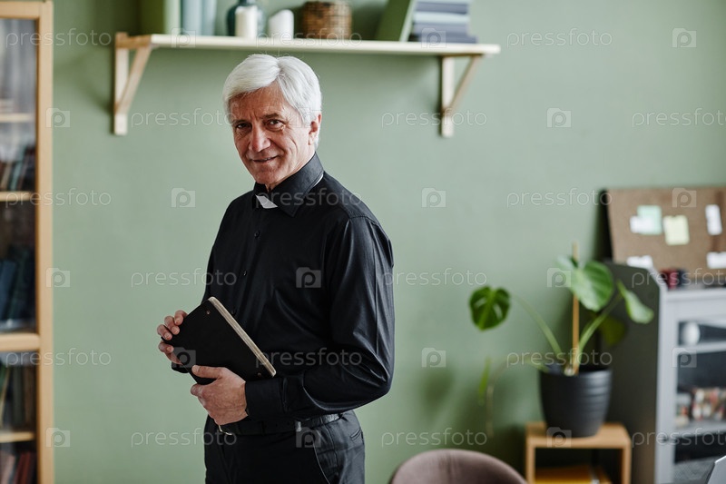 Улыбающийся старший священник смотрит в камеру и держит Библию, стоя на посту