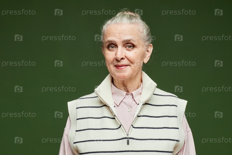 Счастливая старшая женщина в полосатой повседневной одежде смотрит на камеру
