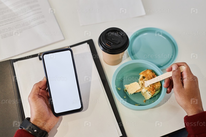 Top view Бизнесмен держит смартфон с макетом экрана, ест еду на вынос