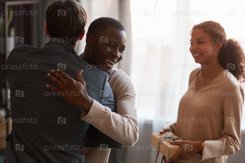 Счастливый молодой афроамериканец обнимает своего приятеля