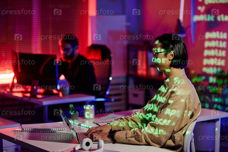 Современный молодой инженер-программист, сидящий на рабочем месте перед ноутбуком