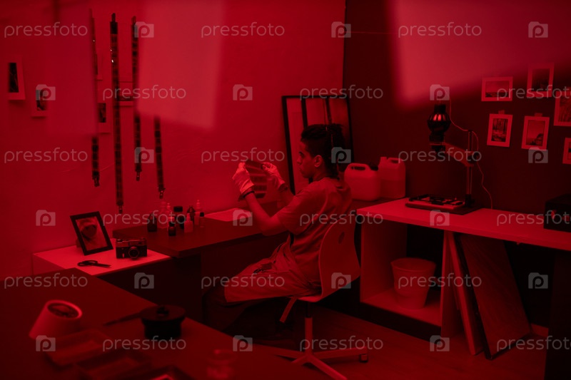 Фотограф, работающий с фотографиями в темной комнате
