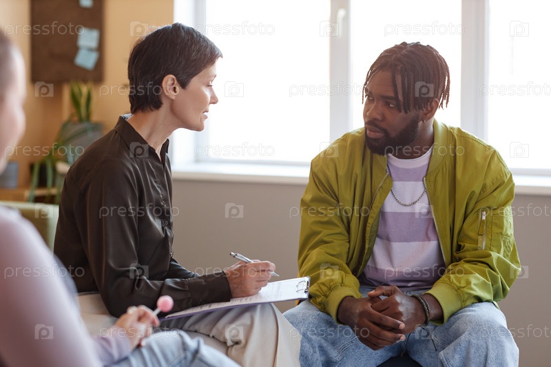 Психолог разговаривает с людьми на сеансе