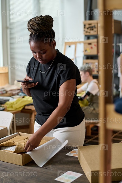 Молодая серьезная черная женщина фотографирует сложенную и упакованную одежду