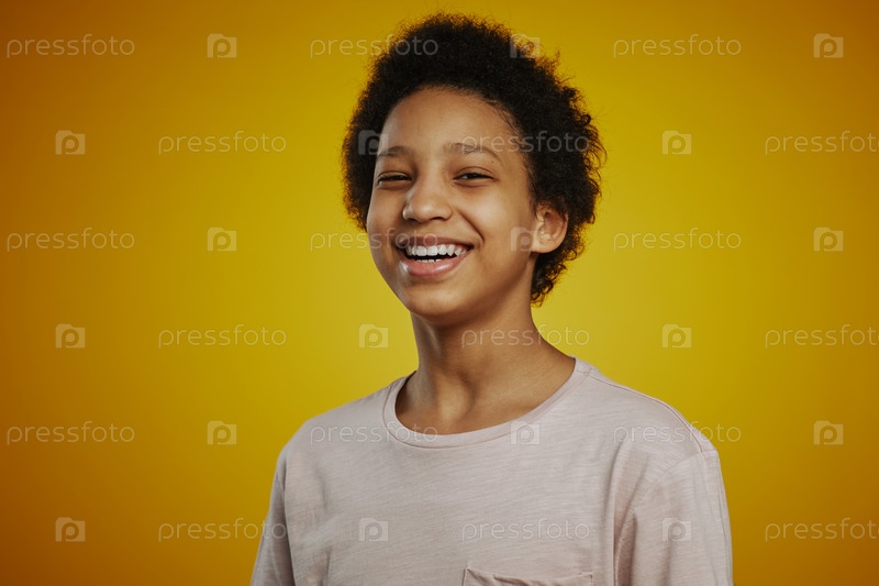 Веселая девочка-подросток в футболке смеется перед камерой