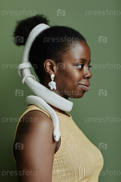 Боковой вид молодой чернокожей женщины с змеей, обтягивающей ее волосы