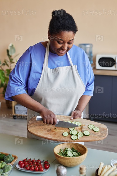 Веселая чернокожая женщина готовит на кухне и режет овощи в салат
