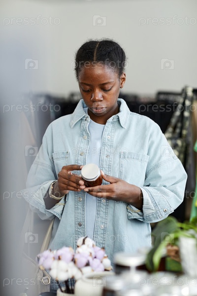 Молодая чернокожая женщина смотрит на предметы декора в магазине подержанных товаров