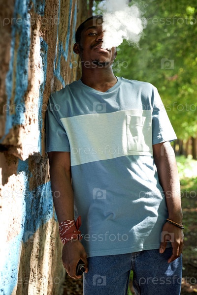 Портрет афроамериканского парня в повседневной одежде, курящего у стены здания
