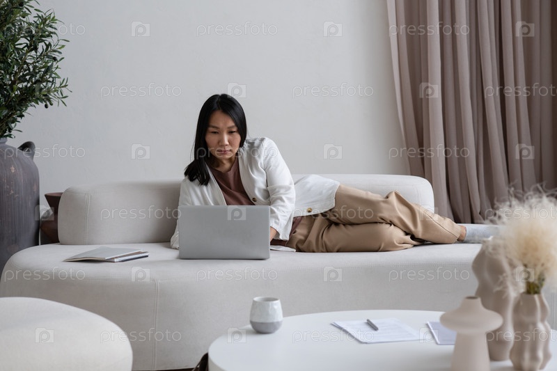 Серьезный молодой азиатский менеджер смотрит на экран ноутбука