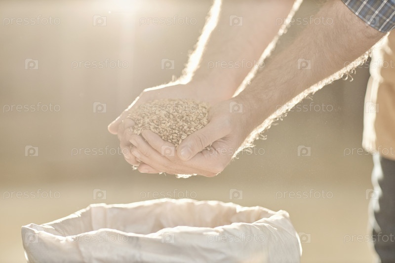 Мужские руки наливают пшеничные культуры в мешочки из шерсти