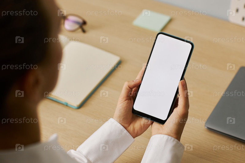 Близкий снимок молодой женщины, держащей смартфон с макетом белого экрана на рабочем месте