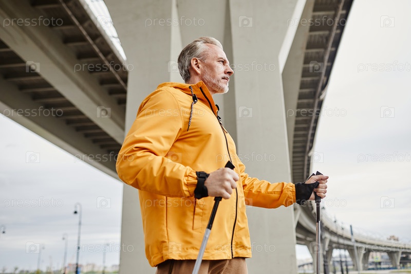 Зрелый мужчина скандинавская ходьба по городу
