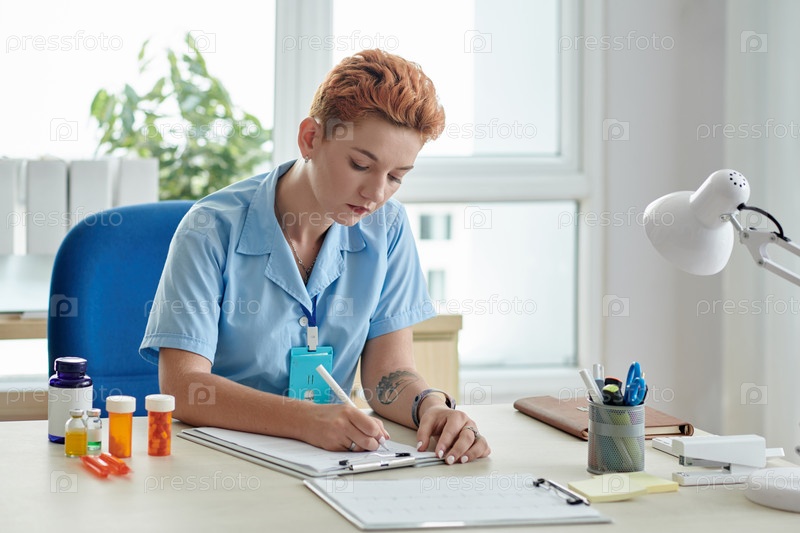 Медсестра пишет рецепт на карточке