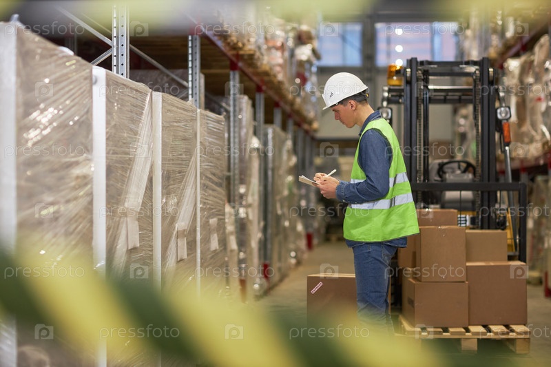Молодой рабочий-мужчина делает обзор акций на складе, пишет на доске записи