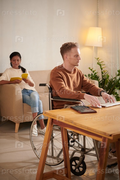 Человек в инвалидном кресле, работающий на компьютере