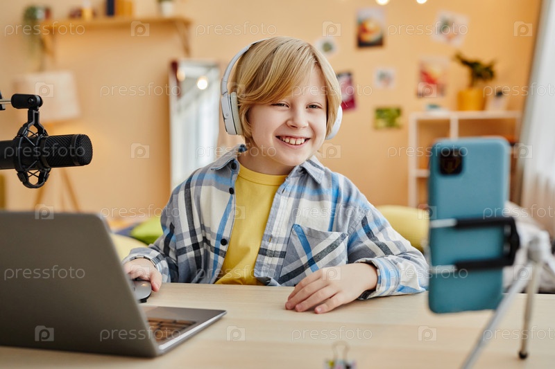 Милый улыбающийся школьник в наушниках смотрит на экран смартфона