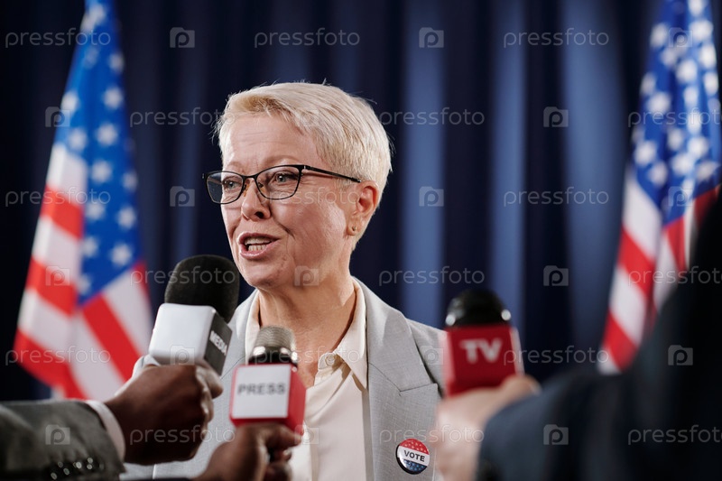 Зрелая блондинка-депутат или американский делегат, говорящий в микрофонах