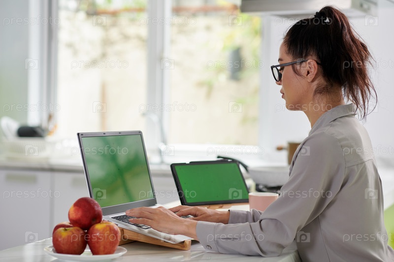 Боковый вид молодой современной деловой женщины в повседневной одежде, печатающей на клавиатуре ноутбука