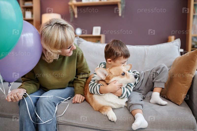 Мать и сын с синдромом Дауна обнимаются с собакой, сидящей на диване вместе