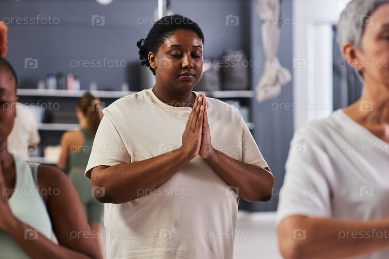 Афроамериканка занимается йогой в классе