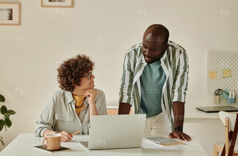 Бизнесмены обсуждают онлайн-работу на ноутбуке