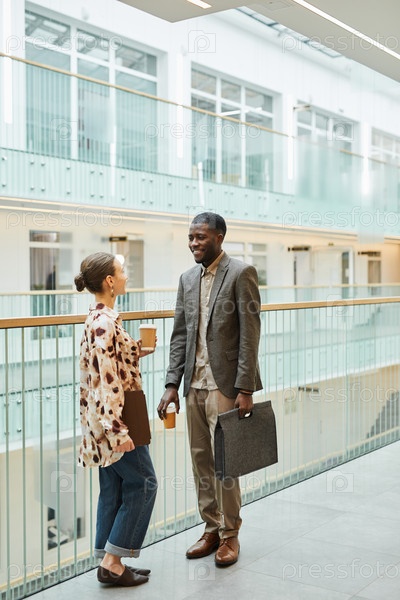 Молодые люди беседуют на офисном балконе