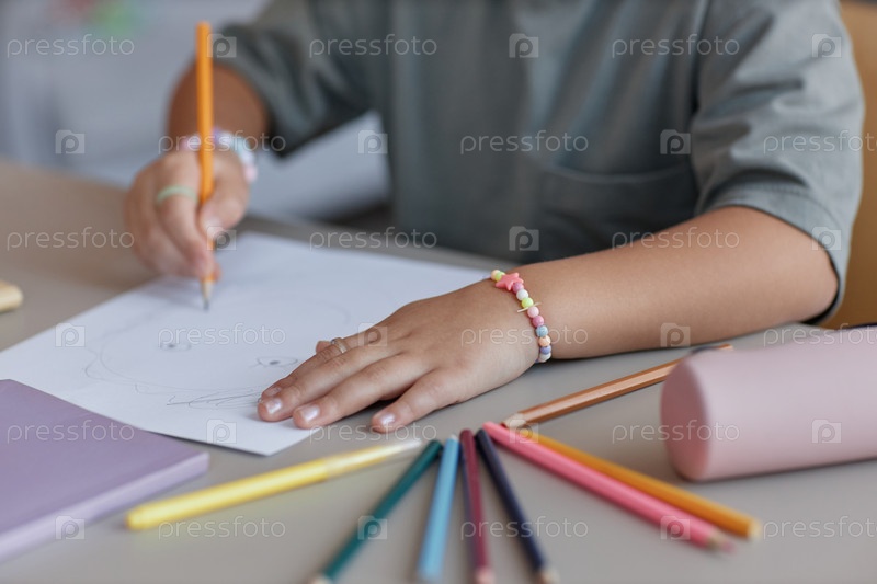 Маленькая девочка рисует лицо цветными карандашами за столом в помещении