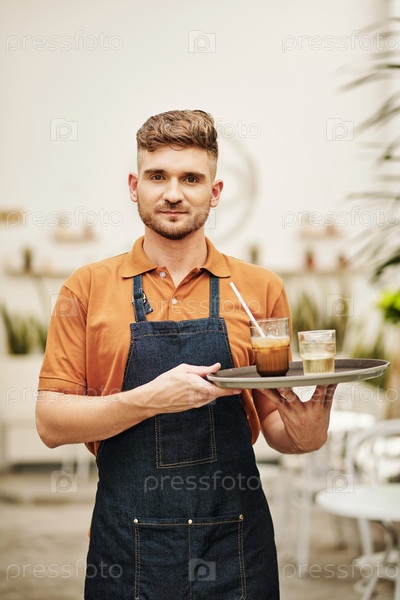 Позитивный официант, держащий поднос