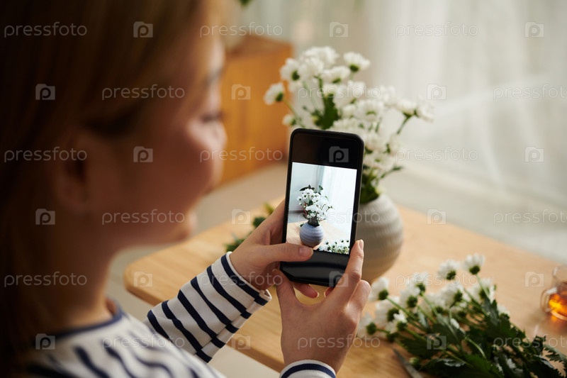 Женщина фотографирует цветы Дейзи в вазе