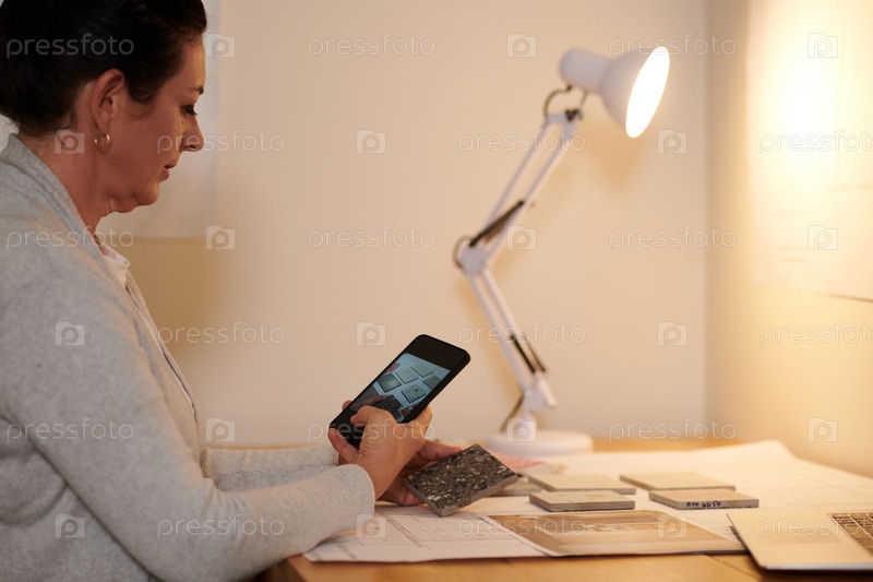 Дизайнер фотографирует образцы напольных плиток