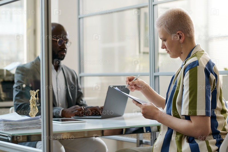 Женщина, подписывающая контракт во время встречи с адвокатом