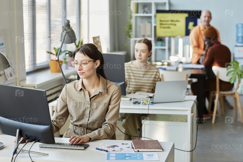 Молодая бизнесвумен использует компьютер на рабочем месте