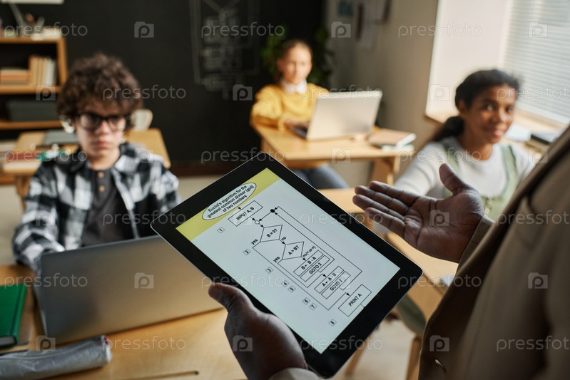 Учитель использует планшетный компьютер на уроке