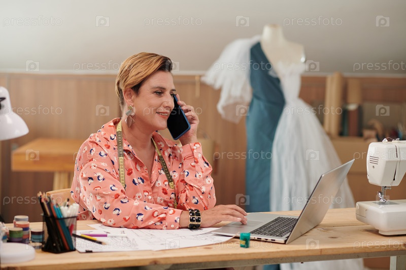 Улыбающийся зрелый портной разговаривает по телефону с клиентом и проверяет электронную почту