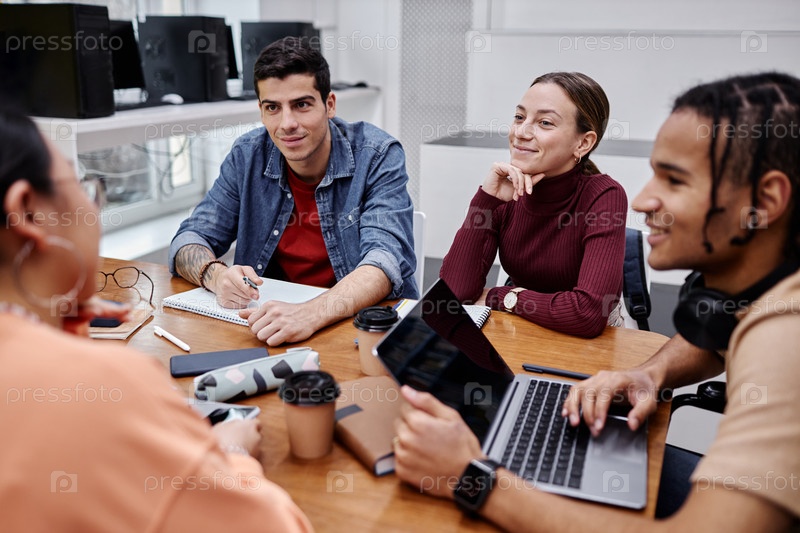 Разнообразная группа студентов учится вместе в гостиной колледжа девушка улыбается