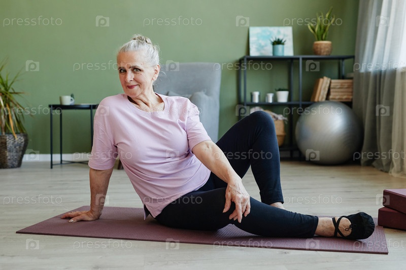 Счастливая активная старшая женщина смотрит на камеру, сидя на мата