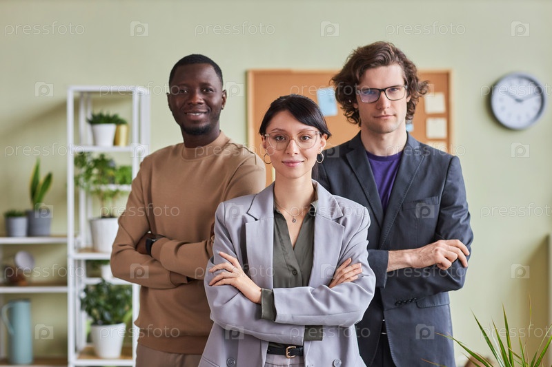 Разнообразная группа молодых людей в офисе, уверенно позирующих с скрещенными руками