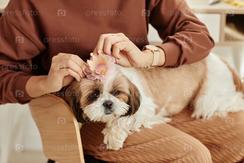 Ближайшее изображение молодой женщины, которая кладет милый лук на собаку и наслаждается уходом за домашним животным в уютном доме
