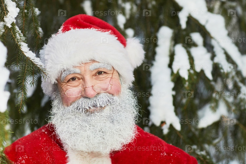 Портрет улыбающегося Санты в зимнем лесу