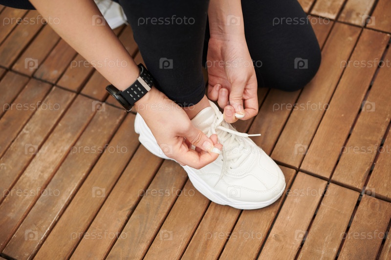 Женщина-спортсменка подвязывает шнурки на шоу