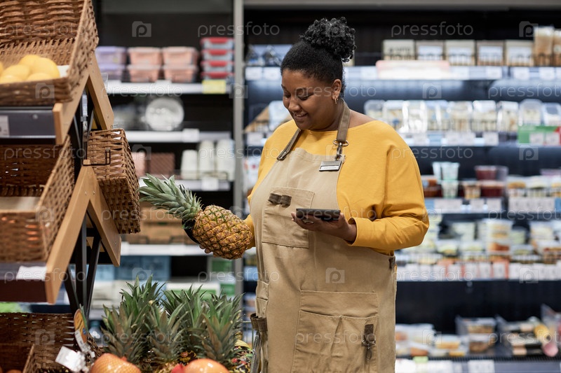 Улыбающаяся чернокожая женщина наслаждается работой в супермаркете и осматривает экзотические фрукты