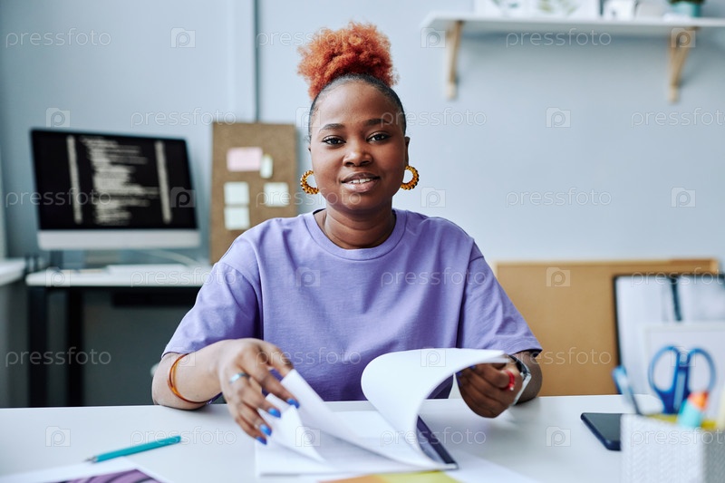 Молодая чернокожая женщина, одетая в фиолетовый наряд на рабочем месте и смотрящая на камеру