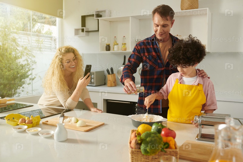 Семья, делающая тесто из макарон