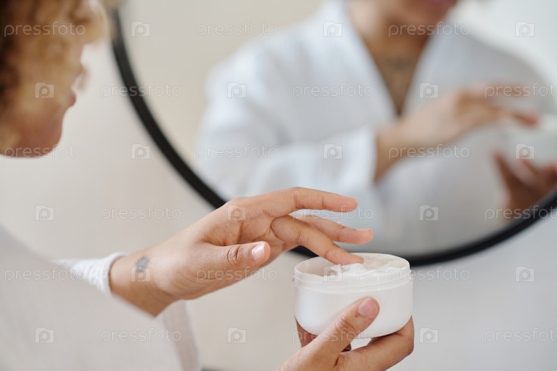 Сосредоточьтесь на руке молодой женщины, принимающей увлажняющий крем