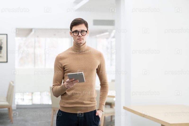 Молодой уверенный предприниматель в умной повседневной одежде, держащий цифровой планшет